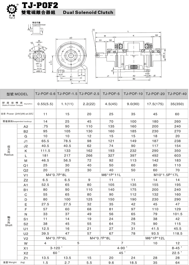 東莞天機(jī)傳動(dòng)(臺(tái)灣天機(jī)牌)生產(chǎn)廠家銷售的POF2型雙電磁離合器組合體又稱軸式雙電磁離合器組合體,是由兩個(gè)電磁離合器組合而成。采用的進(jìn)口原材料,臺(tái)灣生產(chǎn)加工技術(shù),用的是DC24V直流電壓,產(chǎn)品通過ISO9001質(zhì)量管理體系認(rèn)證,質(zhì)量放心可靠,讓客戶購(gòu)買無憂。該P(yáng)OF2型雙電磁離合器組合體,軸式雙電磁離合器組合體結(jié)構(gòu)非常獨(dú)特,安裝也極為簡(jiǎn)便。緊湊的貫通軸結(jié)構(gòu),即兩個(gè)電磁離合器都裝置在同軸上,極其的合理配置產(chǎn)著各種部件,是一種極其獨(dú)特的組合,適用于正反轉(zhuǎn)、變速、動(dòng)力分配、連接、切離、高速運(yùn)轉(zhuǎn)等多用途??蓪?shí)現(xiàn)多種功能,由此機(jī)型可實(shí)現(xiàn)二級(jí)變速、高頻度正反轉(zhuǎn)等復(fù)雜并且高精度的控制等多種功能,同時(shí)可以實(shí)現(xiàn)傳遞機(jī)構(gòu)的簡(jiǎn)單化,安裝和使用都極為簡(jiǎn)便,耐用、實(shí)用。