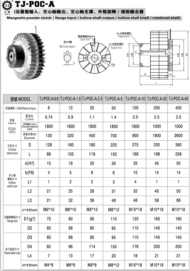 內(nèi)旋轉(zhuǎn)空心軸磁粉離合器的規(guī)格有:TJ-POC-A-0.6、TJ-POC-A-1.5、