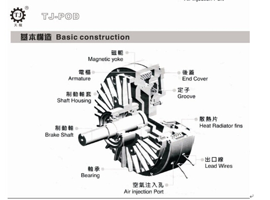 電極、制動(dòng)軸套、磁軛、制動(dòng)軸、軸承、散熱片、定子、后蓋這些部分構(gòu)成;