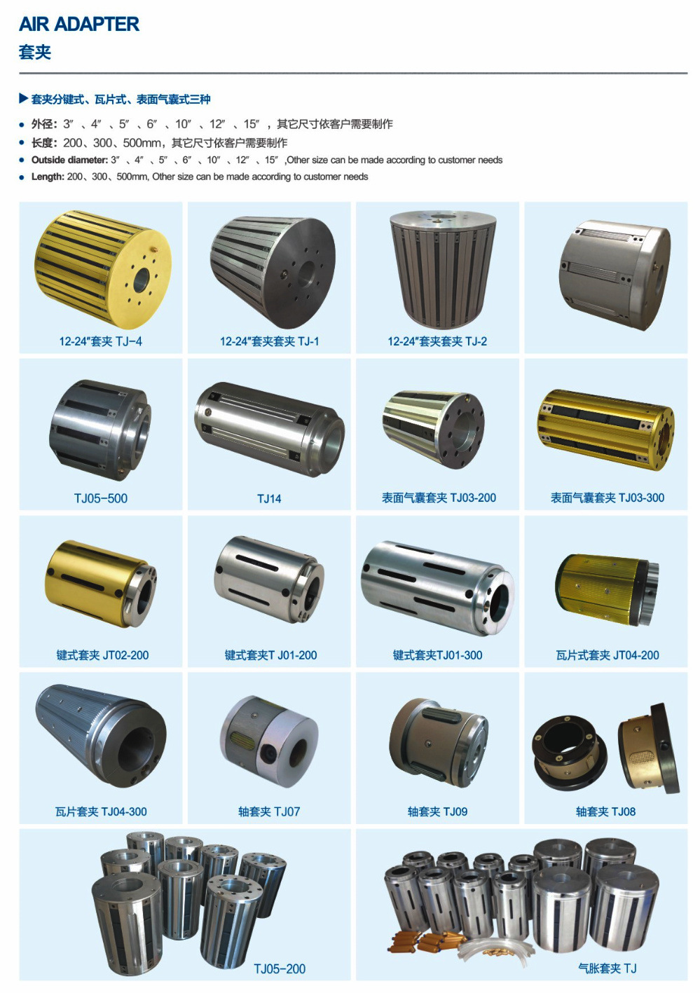鋁合金板條式氣脹套夾,鋼制瓦片式氣脹套夾適用于涂布、分切、印刷、復(fù)卷、復(fù)合、造紙、塑料等相關(guān)機(jī)械的收放卷軸,適用于其它機(jī)械設(shè)備的有:涂布機(jī)、皮革機(jī)、定型機(jī)、壓花機(jī)、分條機(jī)、模切機(jī)、復(fù)卷機(jī)、復(fù)卷機(jī)、紙筒機(jī)、貼合機(jī)、覆膜機(jī)、吹膜機(jī)、發(fā)泡機(jī)、淋膜機(jī)、壓紋機(jī)、造紙機(jī)、無紡布機(jī)、驗(yàn)布機(jī)、燙金機(jī)、電池設(shè)備等相關(guān)機(jī)械配套之使用。